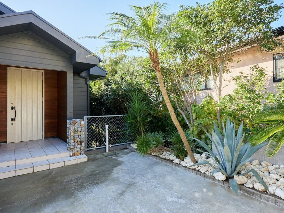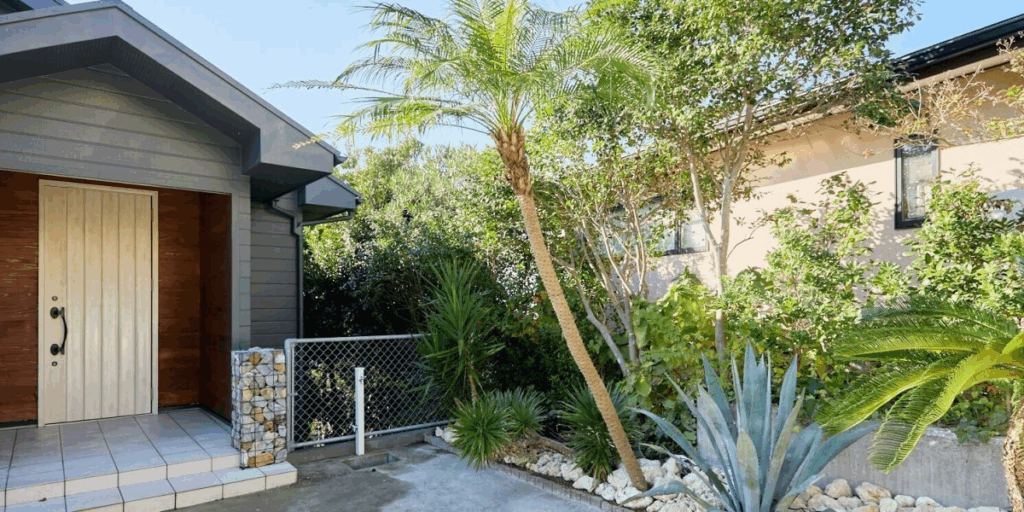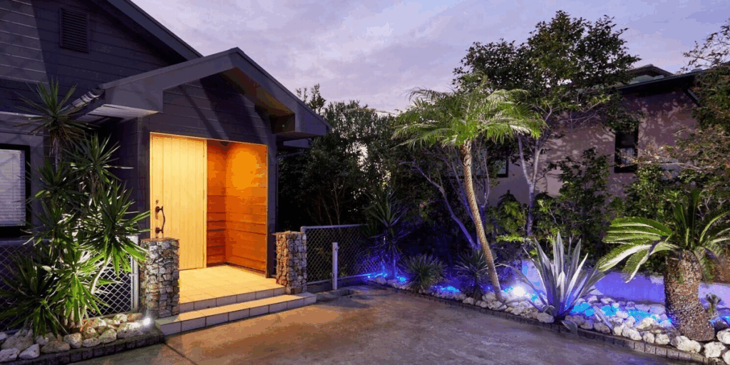 夕陽に照らされる庭からは、海まで続く穏やかな景色が広がります。